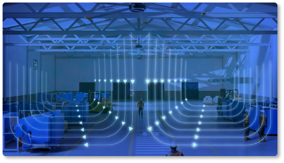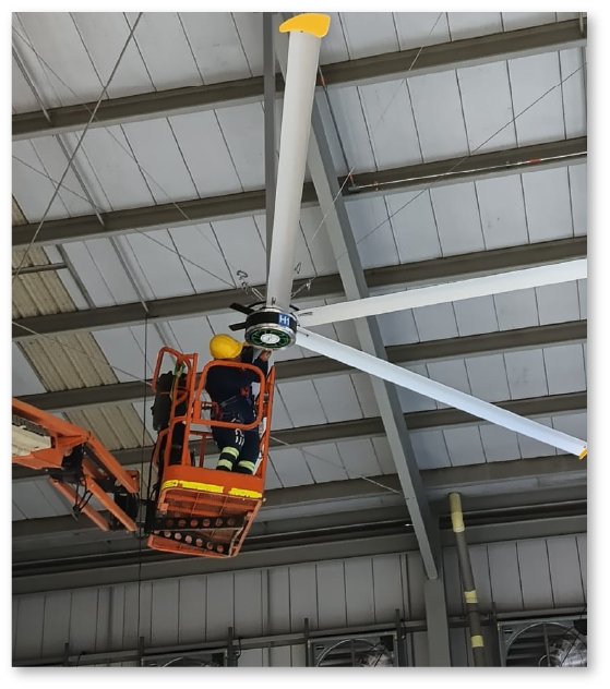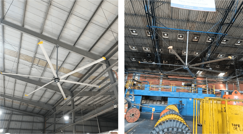 Imagina esto. Un ventilador tan grande que, con solo moverse lentamente, puede generar una brisa suave y constante en todo un almacén, gimnasio ó plazoleta de comidas.